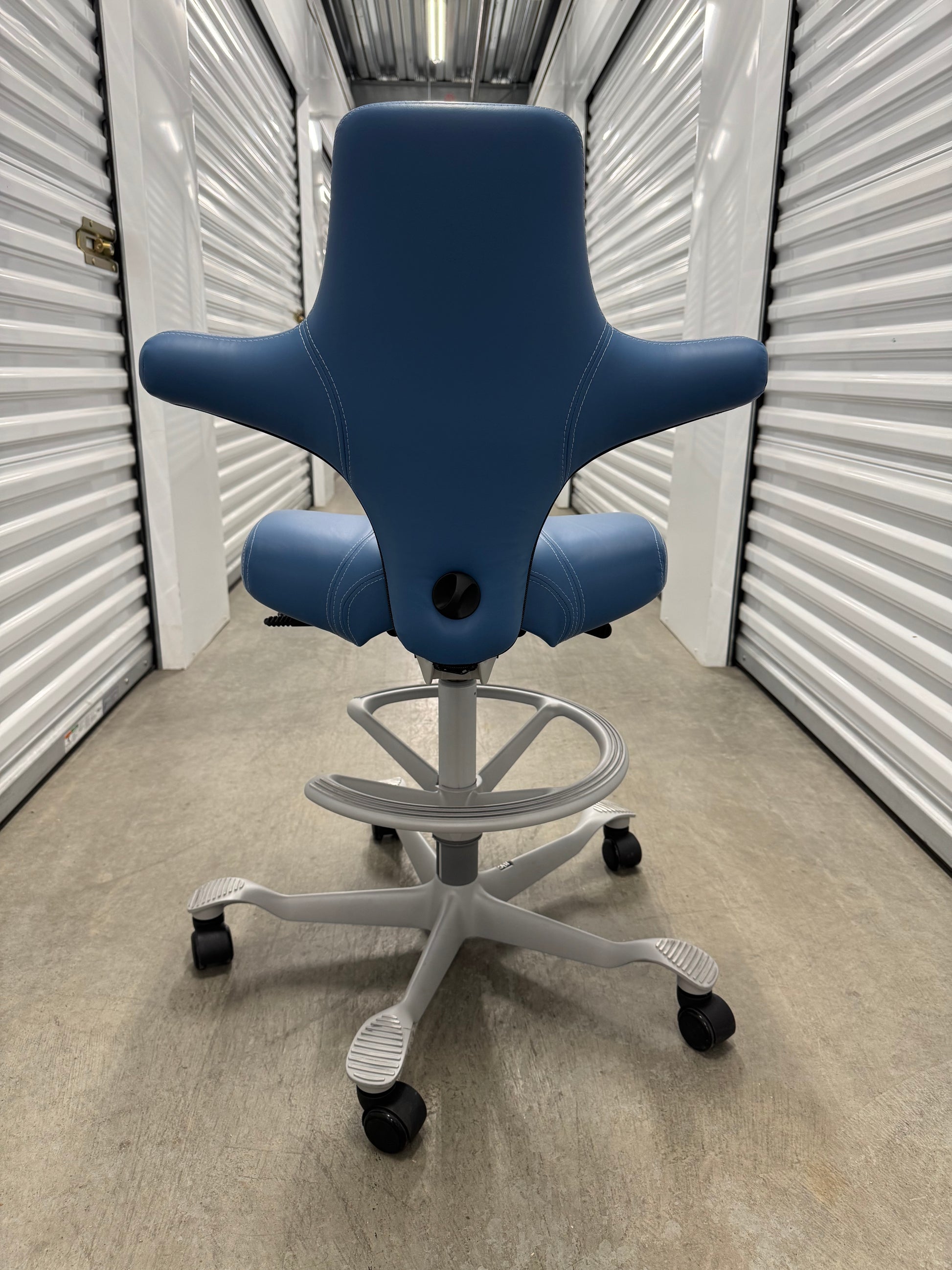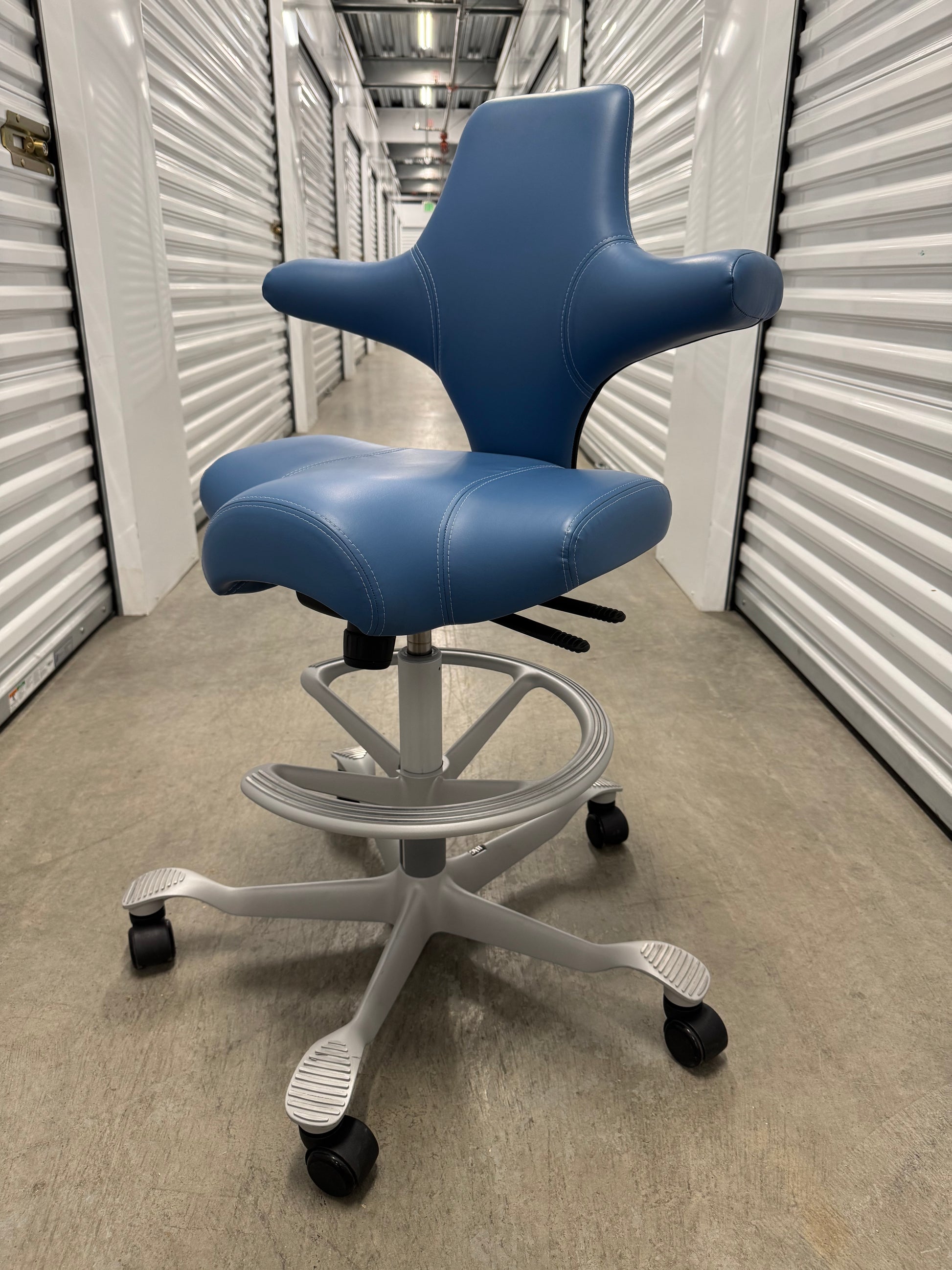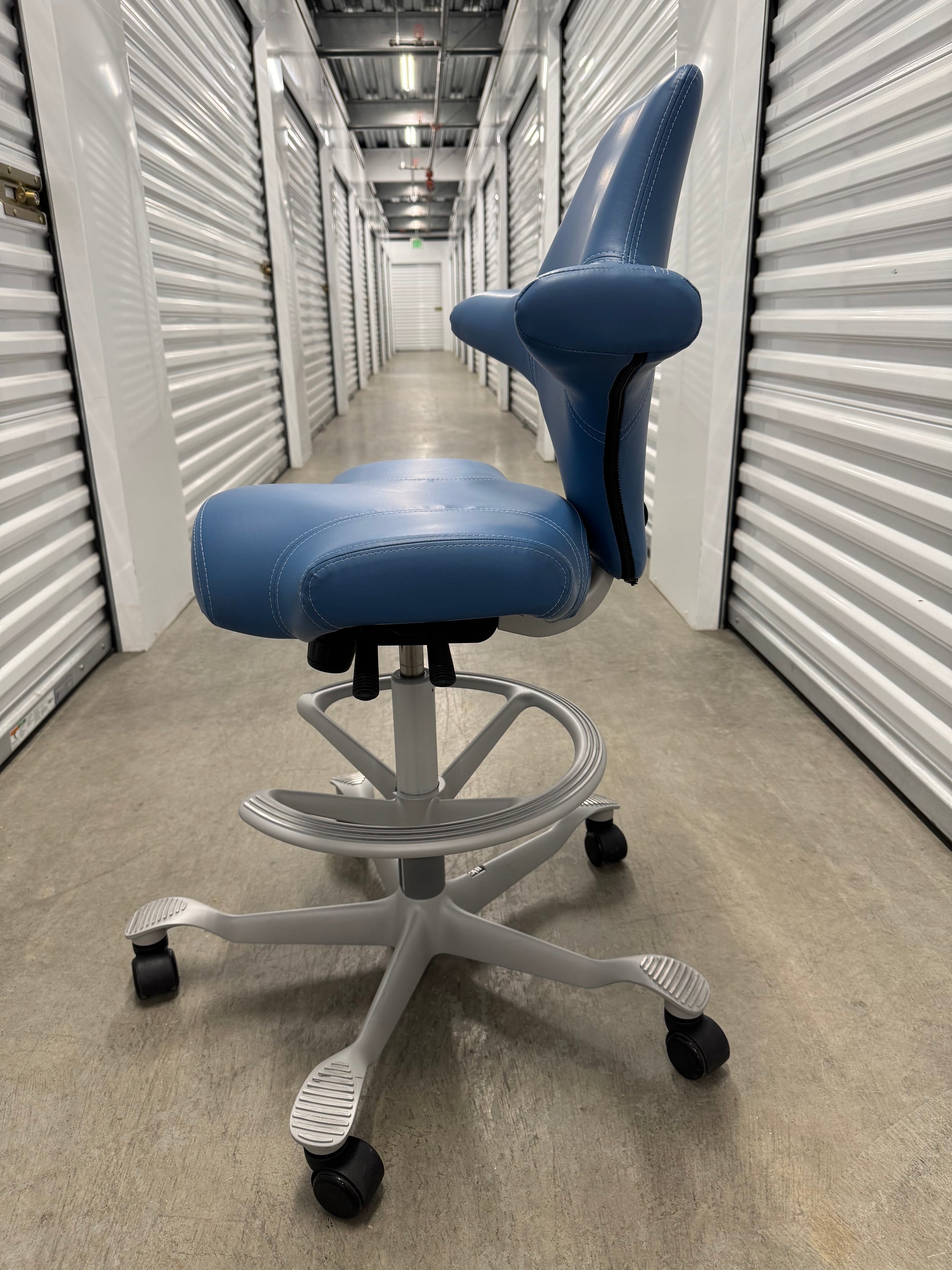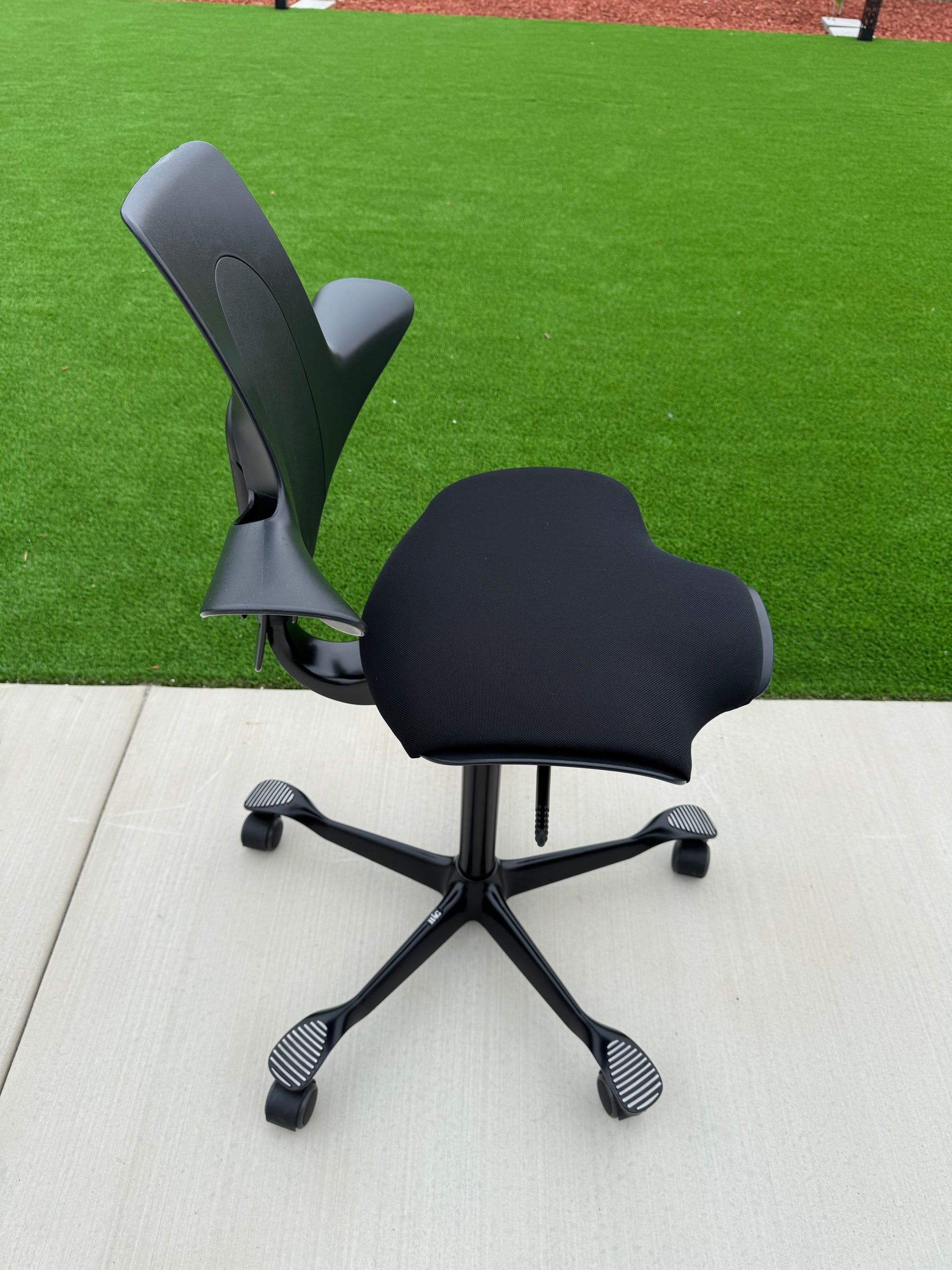 The Puls, (HAG Model #8010), has a firm-but-comfy molded leather seat and back, with an 8.5" wide x 12" deep central seat cushion that offers just enough squish to keep your butt bones happy. A narrower pommel then the classic Capisco may be more comfortable for some people.