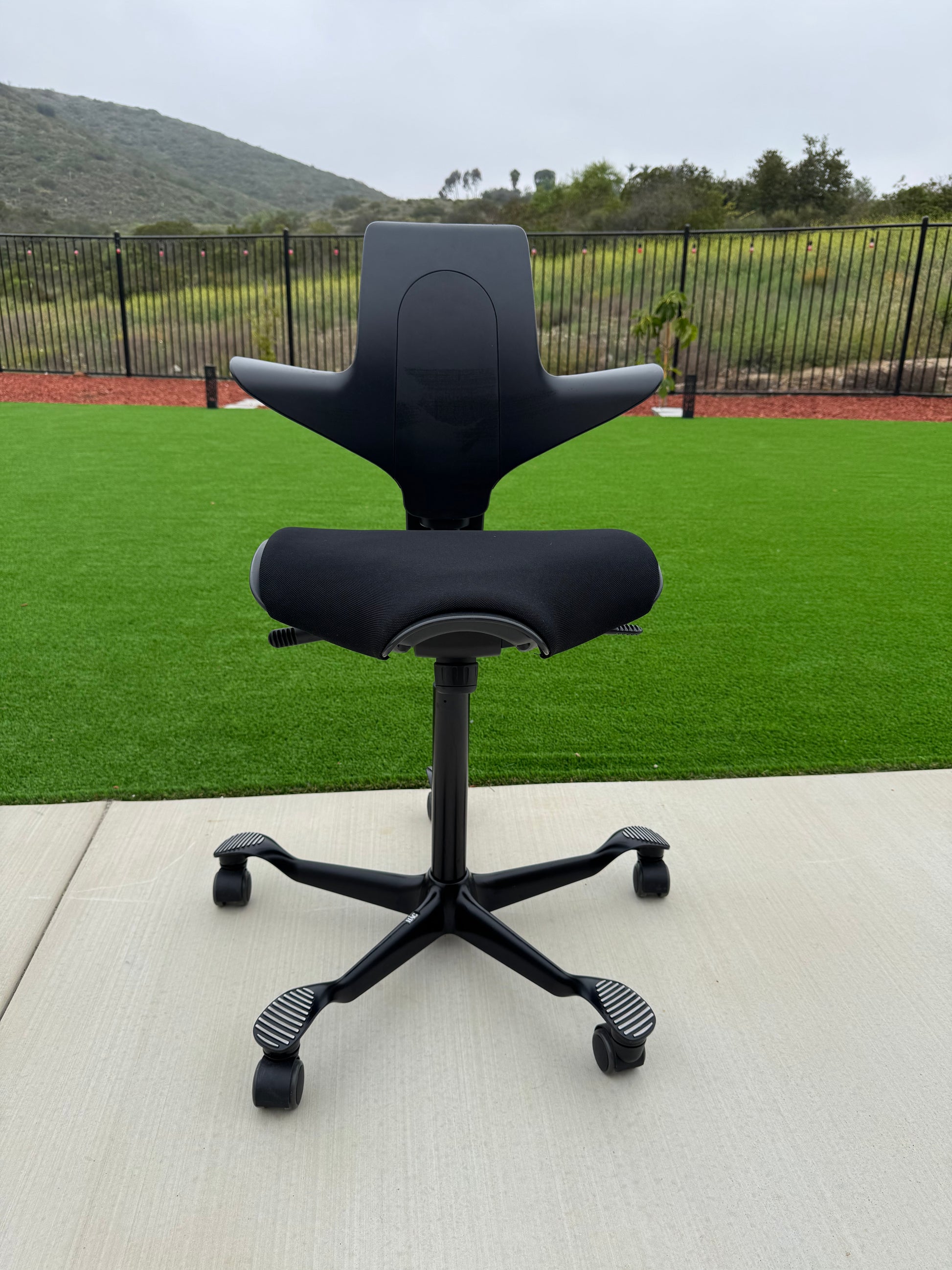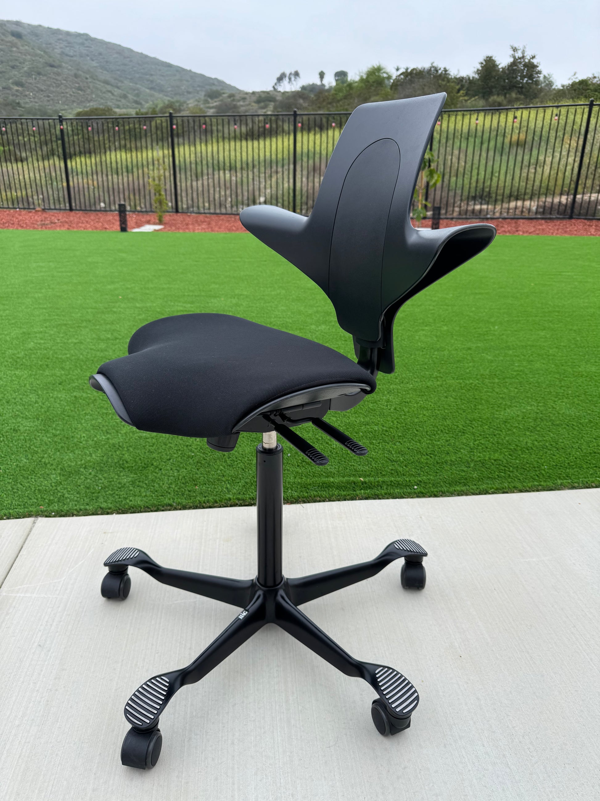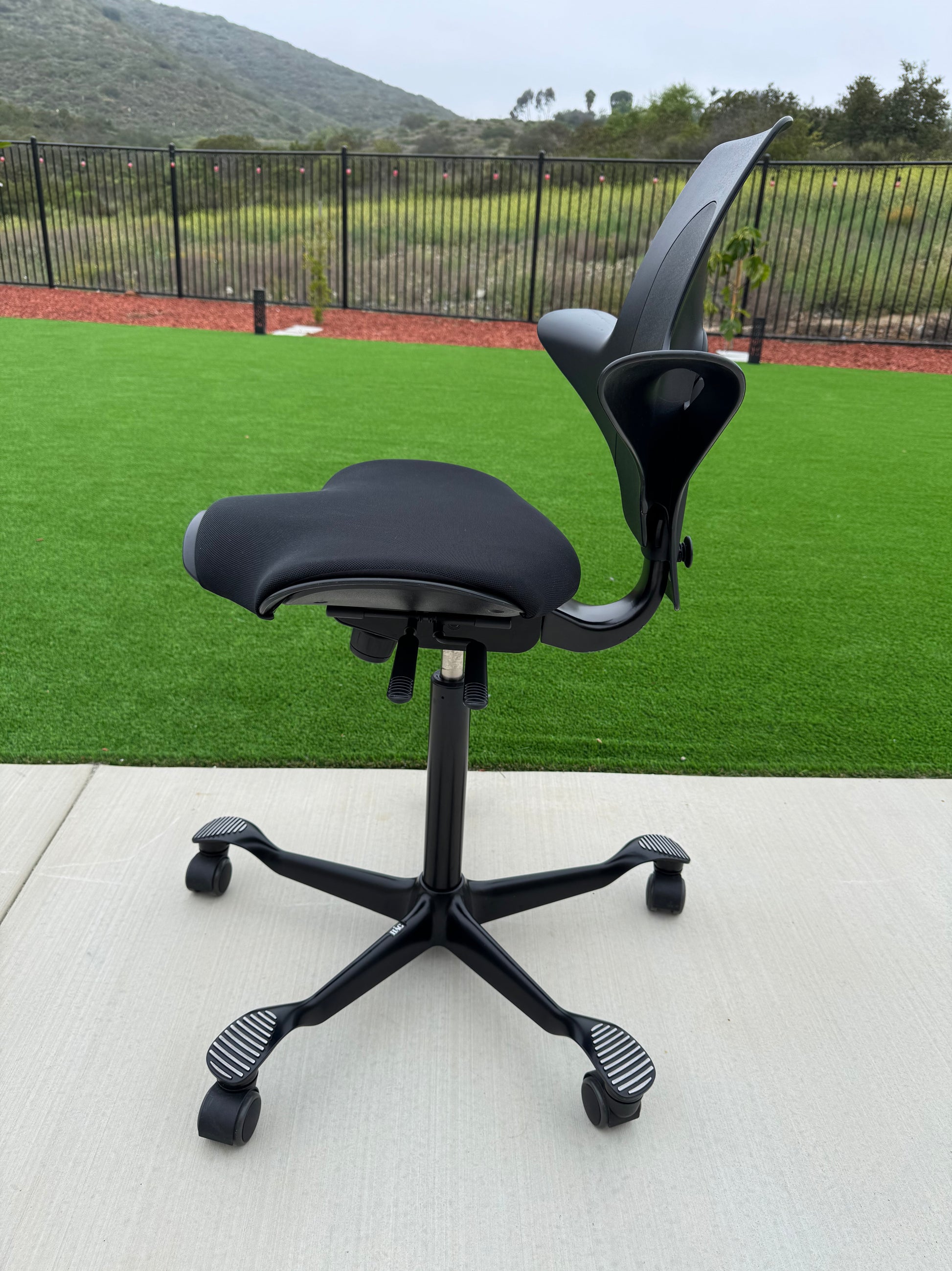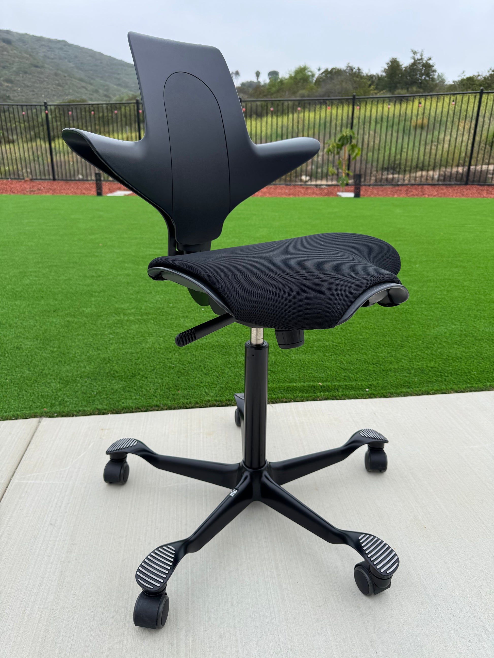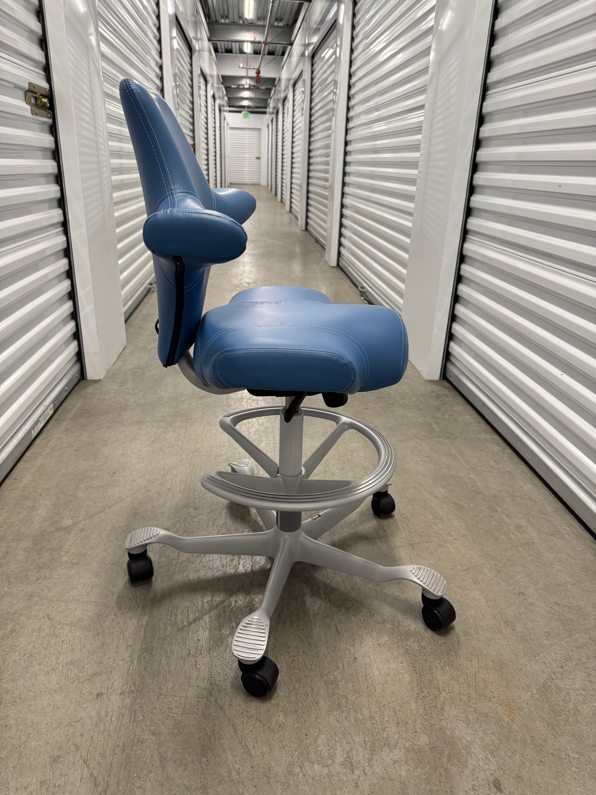 The Puls, (HAG Model #8010), has a firm-but-comfy molded leather seat and back, with an 8.5" wide x 12" deep central seat cushion that offers just enough squish to keep your butt bones happy. A narrower pommel then the classic Capisco may be more comfortable for some people.
